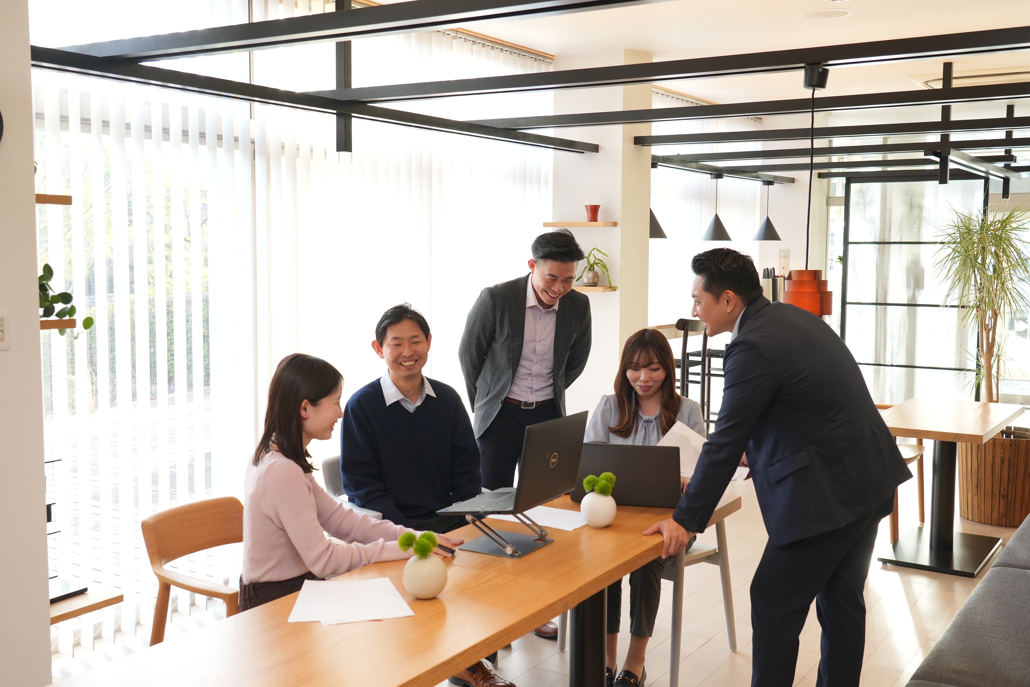 フリーアドレスを導入している職場は明るく開放的。職員の3割は外国籍です。男女問わず、様々な年齢・国籍のスタッフがバリアフリーに交流しています。