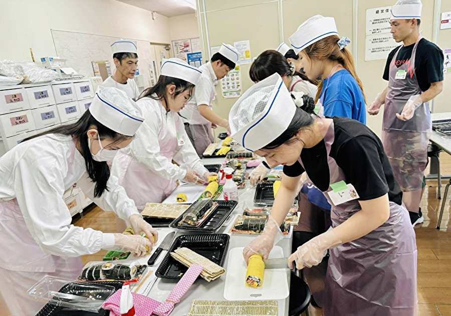 講習会では、実習生の配属先で製造している具材を使用し、講師の方から伝統的な巻き寿司の作り方を教えていただきました。